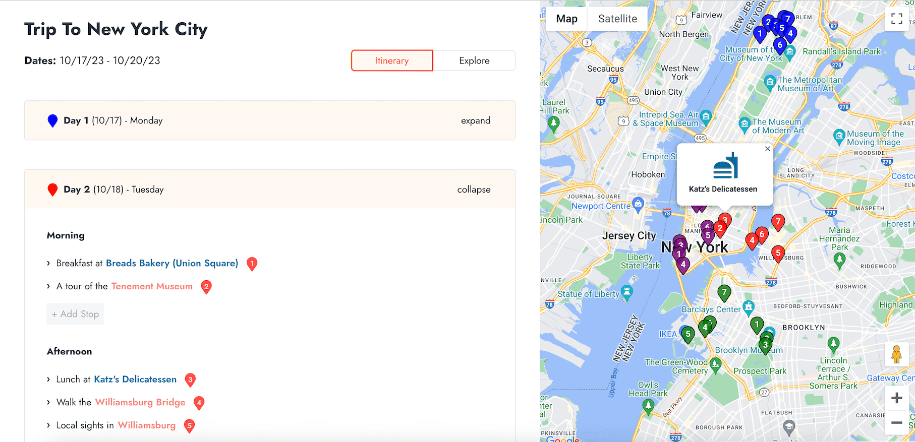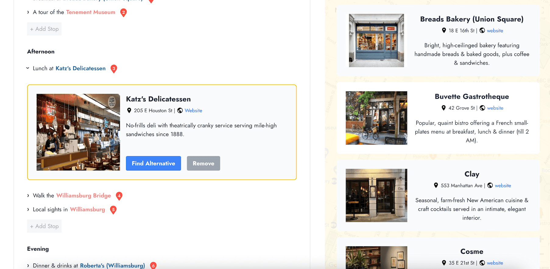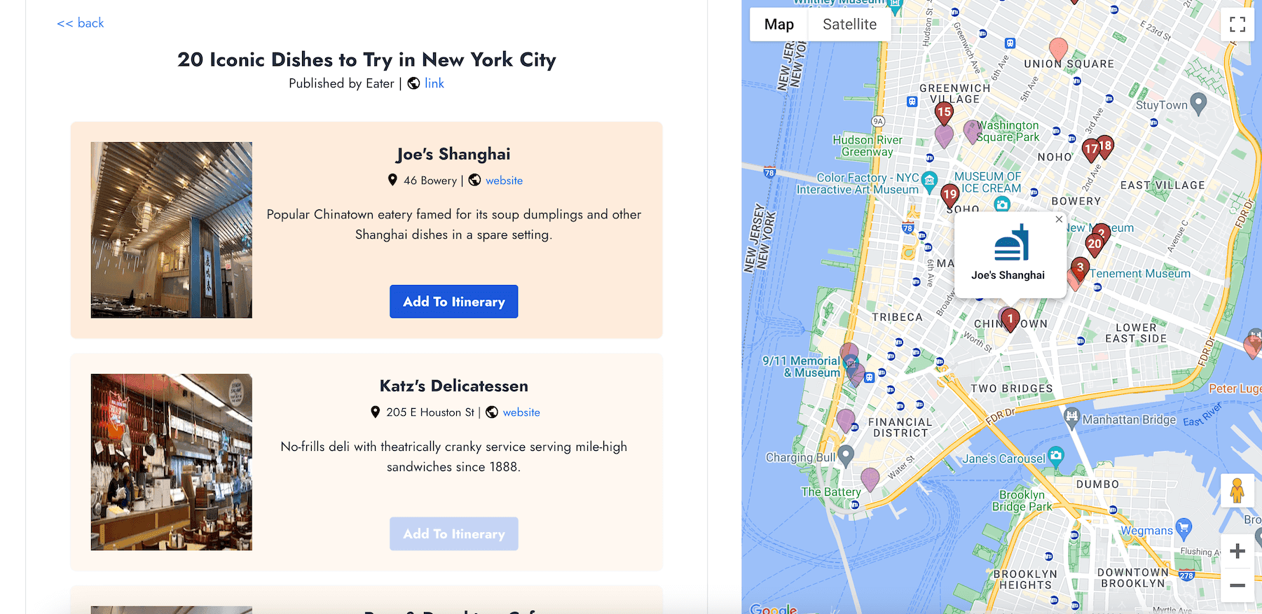 3. Explore in the context of your itinerary: When I'm planning a trip, I reference a bunch of different lists from Eater, Tripadvisor, etc. I figured it would be helpful to bring that exploration into the same platform where I'm building my itinerary. This way I can see if I'll already be near any of the recommended places and seamlessly add them to my itinerary.